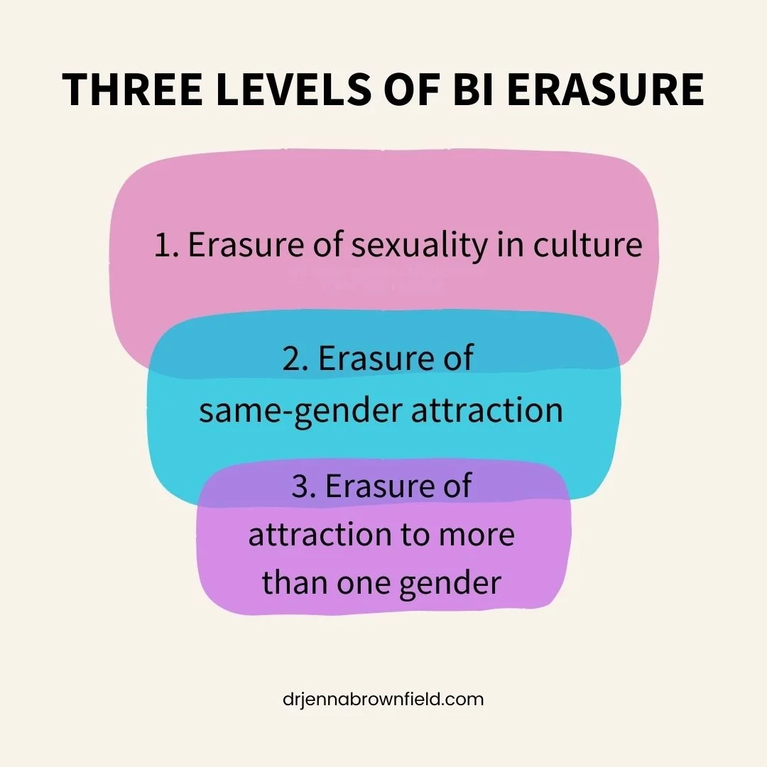 Bi+ identities exist underneath multiple levels of erasure or silencing in our society. Level 1 being that sex in general is often taboo to acknowledge or discuss. And within that, same-gender attraction is viewed as even more taboo than sex in general (Level 2). Finally, we get to Level 3, multi-gender sexual attraction (aka bisexuality, pansexuality, queerness, etc.). Bi erasure occurs because of the compounding effect of these three levels. How can bisexuality be acknowledged when society struggles to even acknowledge sex in general (Level 1) or same-gender attraction (Level 2)?